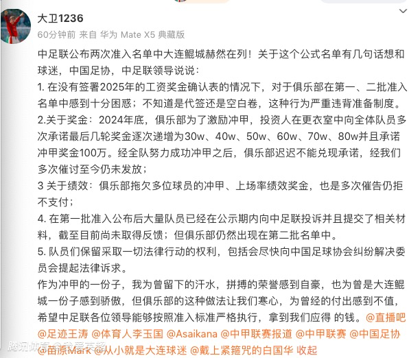 2025-12-26 22:50在中足联先后公布2批完成清债名单的俱乐部之后,北京时间12月26日,效力于中甲大连鲲城俱乐部的36岁名将尹路,效仿去年的韦世豪,公开发文举报所效力的俱乐部准入资格。尹路直言,大连鲲城存在严重欠薪行为,然而该俱乐部却登上了中足联公示的首份完成清债俱乐部名单。