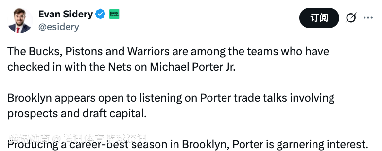 2025-12-26 23:50北京时间12月26日,据美记Evan Sidery报道,雄鹿、活塞与勇士等队,已就小迈克尔-波特的交易事宜与篮网进行了接触。
