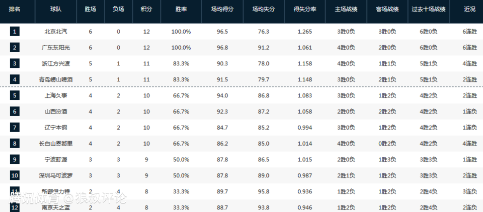 CBA最新排名:京粤6连胜争第1 新疆魔鬼主场2连败 四川唯一0胜