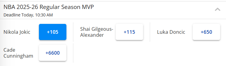 最后是MVP赔率榜,在年终大战前,排在首位的也是亚历山大。如今,约基奇的赔率变成+105,而亚历山大是+115,约基奇同样完成超越,微弱优势领先SGA。