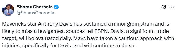 如今浓眉的检查结果出炉,ESPN名记shams报道,消息人士透露,安东尼-戴维斯遭遇腹股沟轻微拉伤,可能将缺席几场比赛。作为球队重要的交易目标,戴维斯将接受每日评估。独行侠在处理伤病问题上一直采取谨慎态度,尤其是戴维斯的伤情,他们将继续这样做。