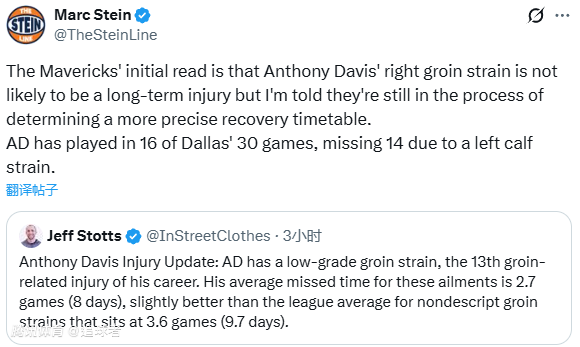 名记Marc Stein报道,独行侠队初步判断浓眉的右腹股沟拉伤不太可能是长期伤病,但他们仍在确定更精确的康复时间表。