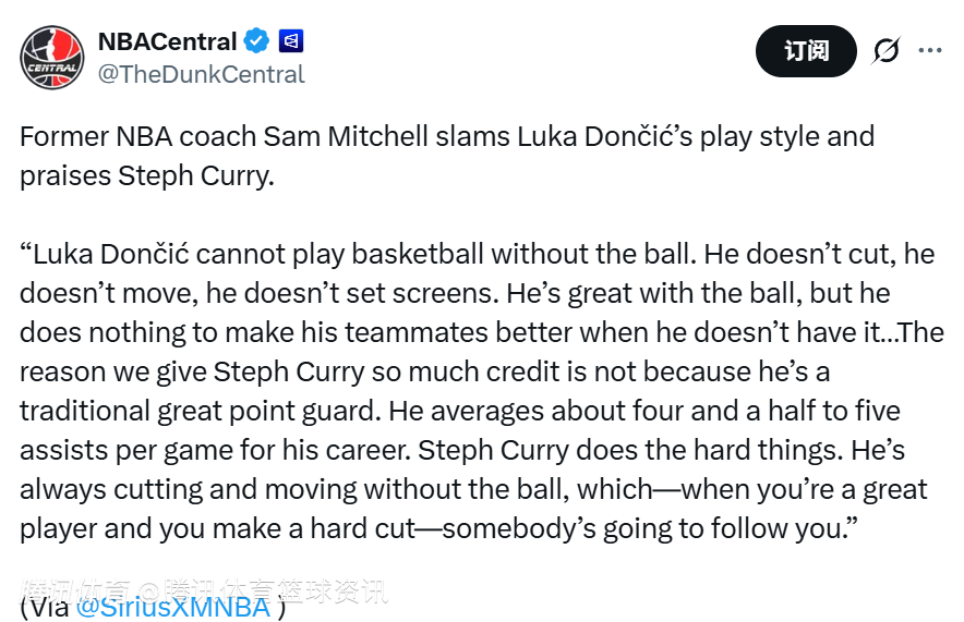米切尔说道:“东契奇一旦手里没球,就不会打球了。他从不空切、从不跑动、也不掩护队友。持球时的他确实天赋出众,但无球状态下,他根本无法为队友创造任何有利条件。我们之所以对库里赞誉有加,并非因为他是传统意义上的顶级控卫,他职业生涯场均助攻也就4.5到5次。库里强在愿意干脏活累活:即便无球在手,他也始终在不停空切、穿插跑动。要知道,当一名球星主动卖力空切时,防守球员就不得不跟着他移动。”