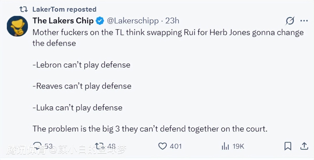 当詹姆斯、里夫斯、东契奇三个核心都不能防守时,难道就交易得到一个3D侧翼就能完全改变球队体系吗?明显是痴人说梦。