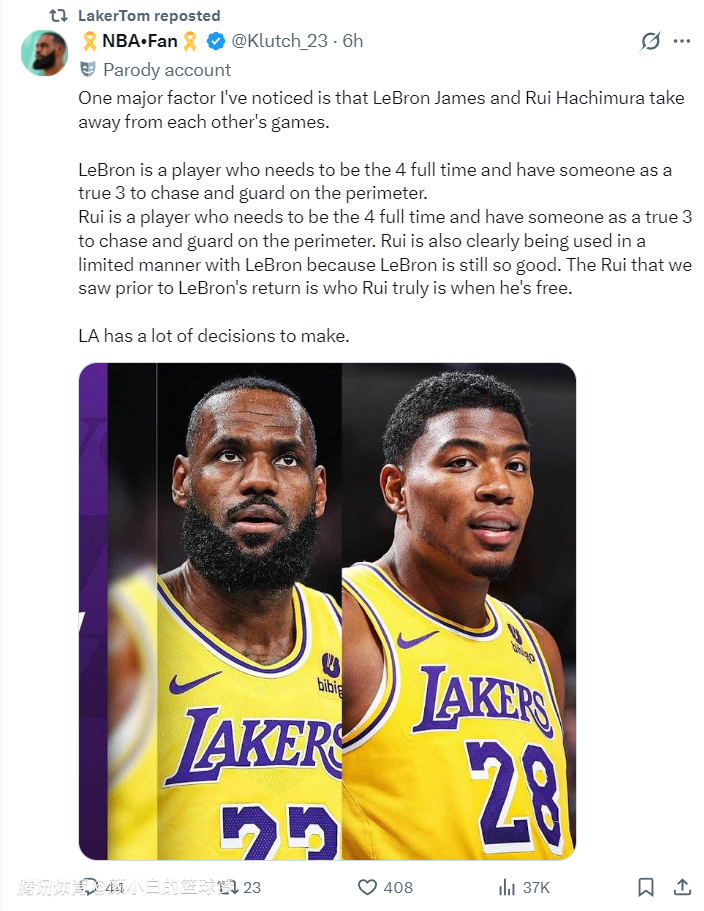 湖媒NBA-Fan还抛出一个论点:詹姆斯与八村垒同时上场会相互制约,但球队没有任何改变。詹姆斯需要长期打四号位,八村垒同样需要长期打四号位,这两人都需要一位真正的三号位帮助他们拉开空间/防守,詹姆斯复出后严重制约八村的发挥,因为41岁的勒布朗依旧出色,可八村垒也是无法防三号位的PF。