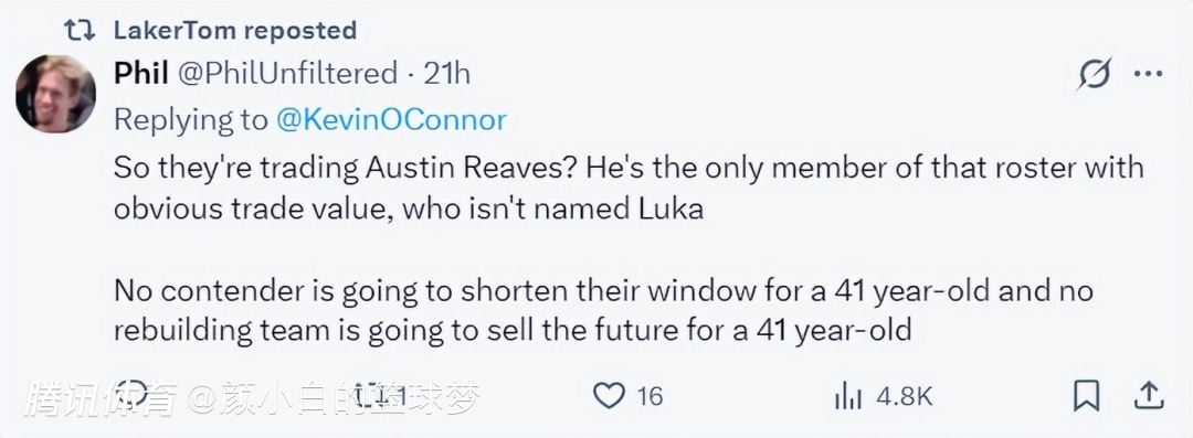 凯文-奥康纳在播客中说道,湖人的非卖品实际上只有东契奇,41岁的詹姆斯没有任何交易价值,湖人也不是围绕41岁的勒布朗建队,所以湖人要真的改善阵容只能交易奥斯汀-里夫斯。