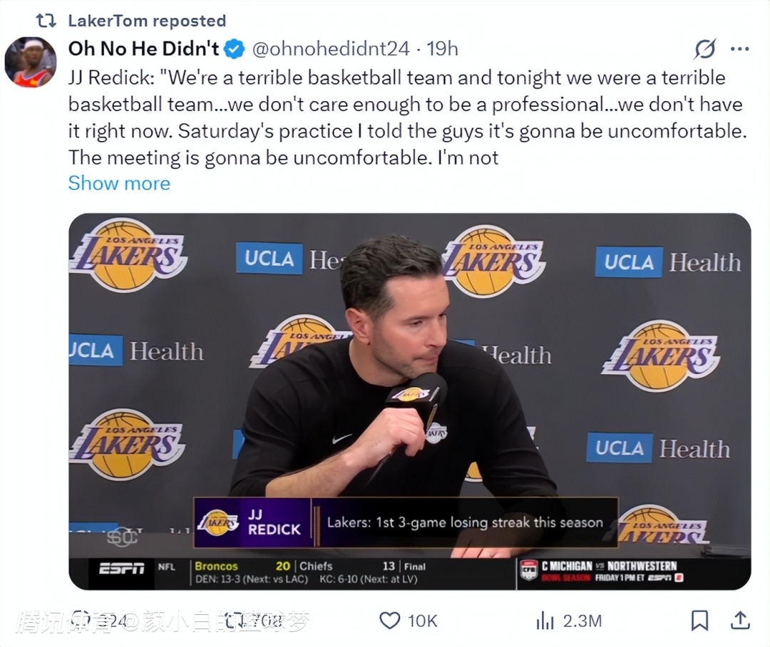 2025-12-27 10:50在湖人惨败火箭赛后雷迪克暴怒,他直指队内某些球员的工作做得不到位,而且没有赢球的欲望,说一套做一套,雷迪克的言论让湖人内部的矛盾摆上台面。很多球迷开始炮轰詹姆斯、东契奇、里夫斯、艾顿、八村垒、雷迪克。