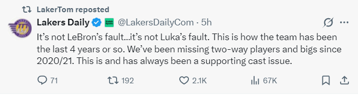 北京时间12月27日晨,湖媒Lakers Daily发声:这不是詹姆斯的错也不是东契奇的错,过去四年湖人一直都是这个样子,从20-21赛季开始我们就缺少攻防双向球员与中锋,替补阵容的问题尤为明显。
