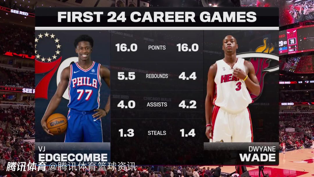 在今日76人队102-109输给公牛队的比赛中,埃奇库姆出战33分钟,13投4中(三分球5投0中)得到10分7篮板3助攻1抢断。在今日比赛期间,转播方曾晒出了埃奇库姆和韦德生涯前24场比赛的数据对比,两人的数据很接近。