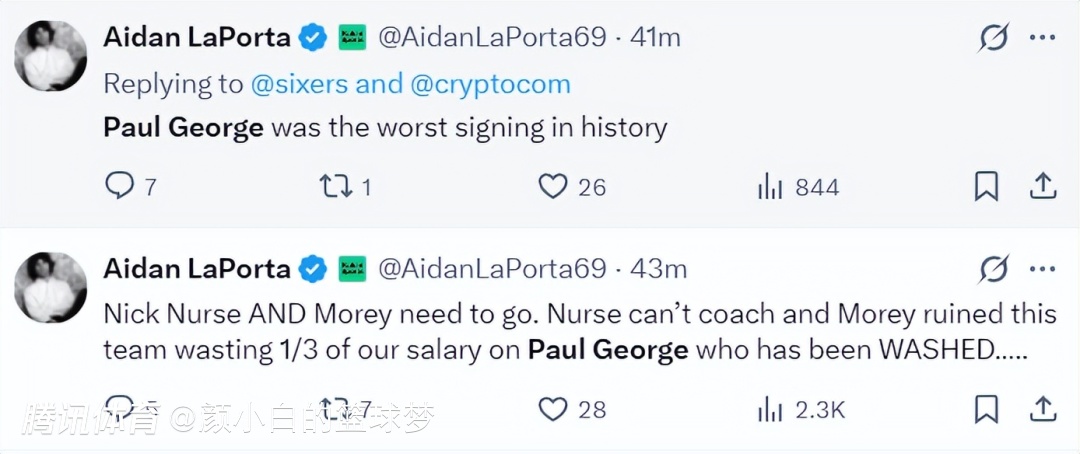 费城记者Aidan LaPorta写道:保罗-乔治的签约是NBA历史上最糟糕的;费城应该解雇尼克-纳斯+开除GM莫Lei,纳斯不懂执教,而GM让这支球队陷入困境,他用了三分之一的薪资花在乔治身上。