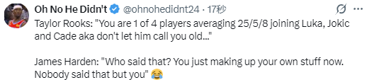 在采访中,主持人表示哈登是本赛季仅有的4位场均25分5篮板8助攻的球员之一,并询问了哈登对于外界有人说他老了的看法。对此哈登调侃道:“谁说的?你这是自己瞎编的吧。除了你没人这么说。”