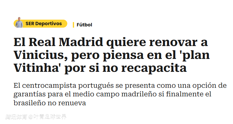 皇马需要维蒂尼亚这样的中场组织大师。克罗斯退役、莫德里奇离队之后,皇马中场没有真正的灵魂人物。琼阿梅尼、卡马文加、贝林厄姆、巴尔韦德,在大局观、掌控能力上都稍逊一筹。不过,塞尔电台也指出,巴黎圣日耳曼绝无可能和皇马谈判维蒂尼亚的转会事宜。
