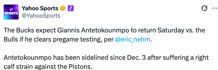 2025-12-28 01:00北京时间12月28日,据雄鹿队记Eric Nehm报道,字母哥预计将在今天对阵芝加哥公牛的比赛中伤愈复出、重返赛场。
