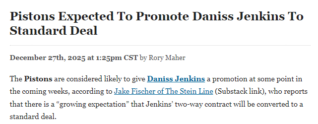 2025-12-28 05:00北京时间12月28日,据名记Jake Fischer报道,活塞队有望在未来几周内转正丹尼斯-詹金斯,消息指出,外界愈发普遍认为球队会将詹金斯的双向合同转为正式合同。