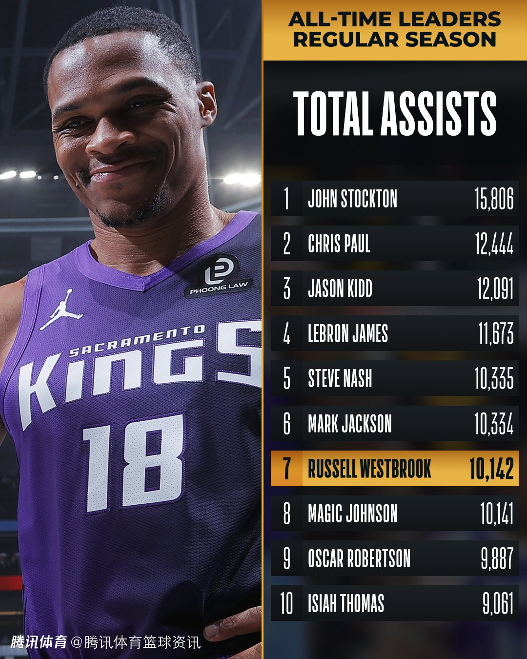 10142次助攻!威少生涯助攻数超越魔术师:升至NBA历史第7位