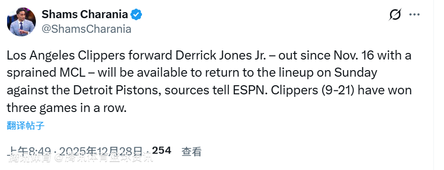 2025-12-28 09:10北京时间12月28日,根据NBA记者Shams报道,快船队球员小德里克-琼斯将在对阵活塞队的比赛中复出。