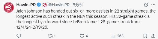 2025-12-28 10:50北京时间12月28日,NBA常规赛继续进行,老鹰队对阵尼克斯队。本场比赛进行到第二节时,杰伦-约翰逊已经送出6次助攻,这是他连续第22场比赛送出至少6次助攻,创造本赛季联盟最长纪录。