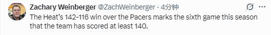 本场比赛,热火队在第三节单节轰下39分,第四节单节轰下44分。这也是热火队本赛季第6次单场得分至少达到140分。