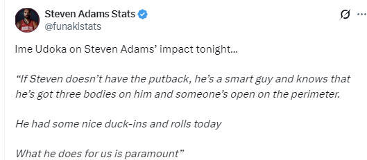 当谈到亚当斯的篮板球表现时,乌度卡说道:“外线三分球的威胁非常关键。如果亚当斯没有直接补篮得分,他也很清楚自己身边会有三名防守球员,那么外线肯定会有人处于空位。所以他总是会留意那些外线的队友。不过回到你的问题,关于场上空间和射手的影响,就像我说的,多名球员都能参与到进攻中,这会让对手的防守顾此失彼,从而给亚当斯创造切入篮下的机会。他今天就有几次漂亮的顺下和空切,并且成功拼抢到了篮板。所以,他的作用对我们来说至关重要。过去几场比赛你也看到了,当他拼抢篮板时,很多队友也会因此获得篮板球的机会。”