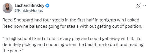在谈到自己如何避免犯规完成抢断时,谢泼德说道:“高中的时候,我几乎每个回合都会尝试预判抢断,而且通常都能侥幸成功。但现在肯定不一样了,我必须学会挑选最佳时机,读懂场上的局势。我很清楚,如果决定出手抢断或封盖,就必须全力以赴确保成功,不能让球队陷入被动,也不能犯下无谓的犯规。”