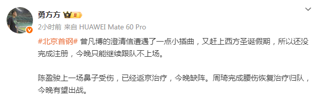 除此之外,曾凡博虽然已经完成续约一个多礼拜,但他的澄清信手续依然没有完成,尤其是赶上西方的圣诞假期,导致他依然没有完成注册,将继续缺席对阵福建男篮的比赛。