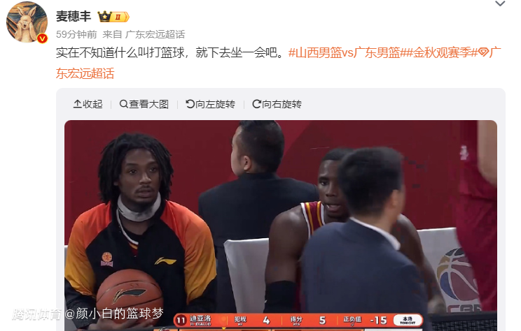 麦穗丰:不懂打篮球你就下去坐着吧。(此役全场比赛迪亚洛16分钟,10中3+三分1中1拿到9分7篮板4助攻2抢断盖帽,正负值-13)