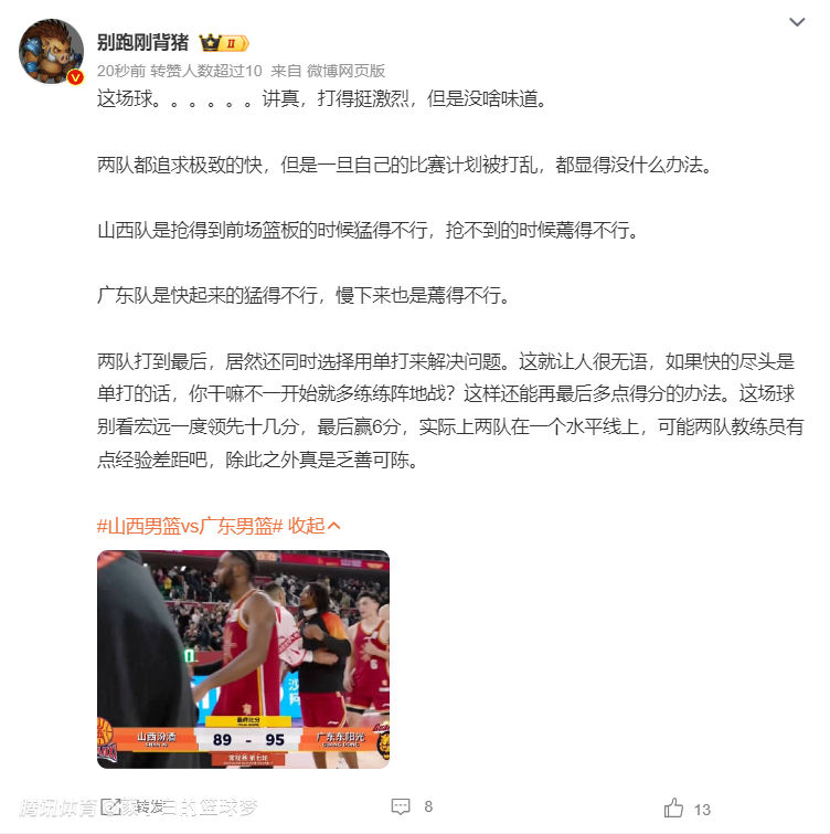 赛后大V别跑刚背猪写道:这场球打得挺激烈但没啥味道,两队打到最后都是靠单打解决问题,别看广东一度领先10多20,可最后只赢6分,实际上两队在一个水平线上,两队教练员有点经验差距,除此之外乏善可陈。