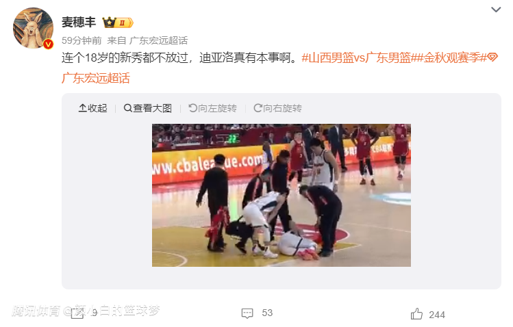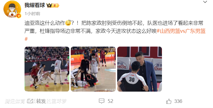 广东自媒体:这迪亚洛什么动作?肘击陈家政倒地不起,队医进场看起来非常严重。(结果并不严重,陈家政末节还打了7分钟)