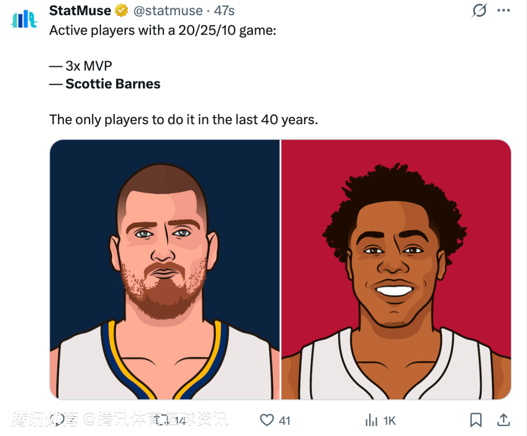 与此同时,现役球员中达成20+25+10神迹的球员,除了巴恩斯之外就是三届MVP得主、掘金球星约基奇,而在过去40年中仅此两人达成此成就。