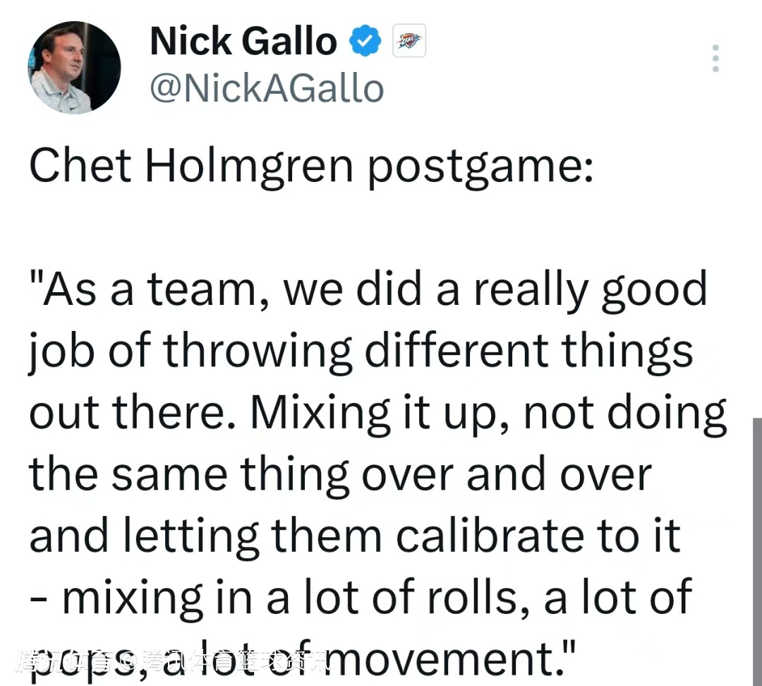 关于本场比赛球队表现,霍姆格伦说道:“全队打得很灵活,战术丰富多变,不一套打法死磕,不让对手摸清节奏。大量挡拆顺下、外弹,配合无球跑动,节奏一直换。”