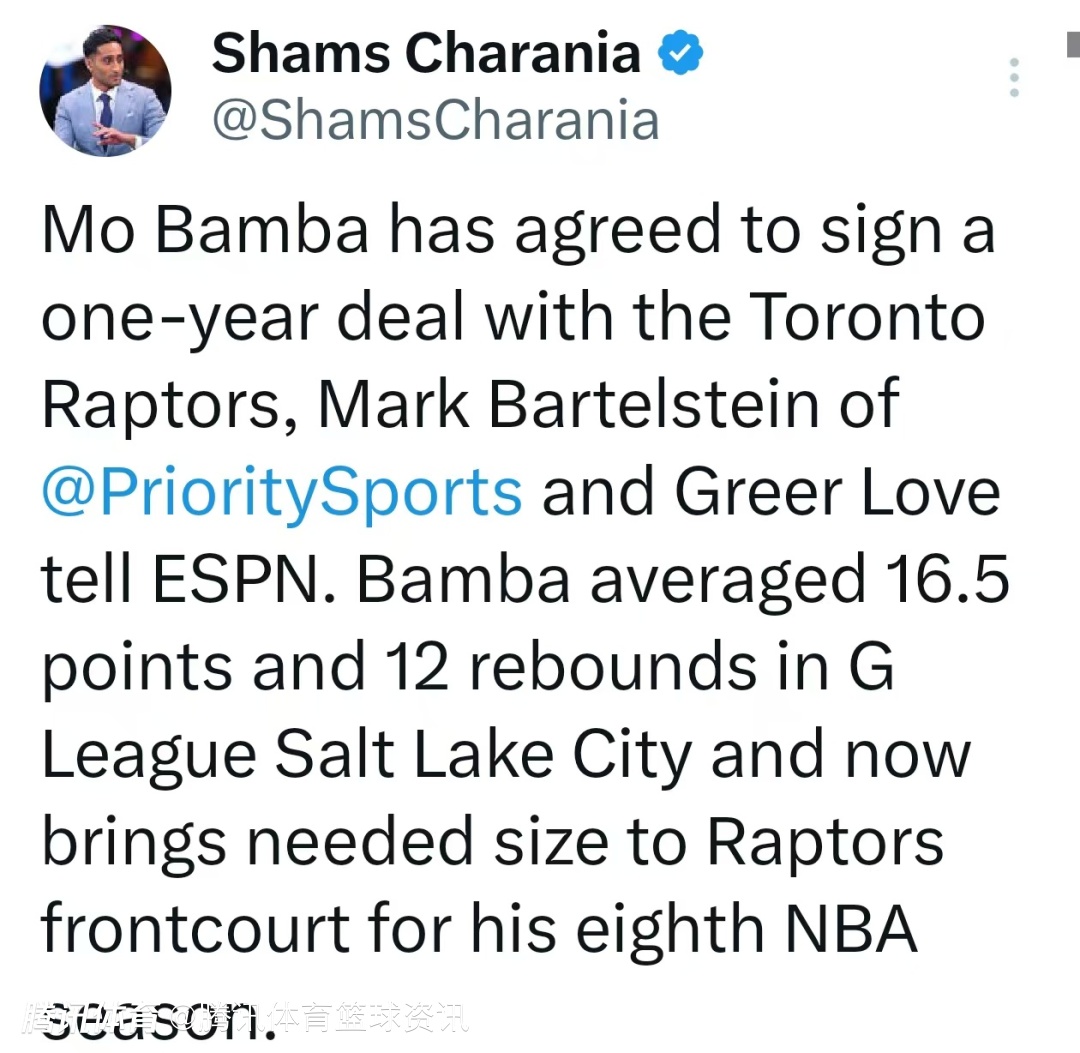 Shams表示,班巴在发展联盟盐湖城队场均16.5分12篮板,生涯第8个NBA赛季加盟猛龙,将为球队前场注入急需的身高体型优势。