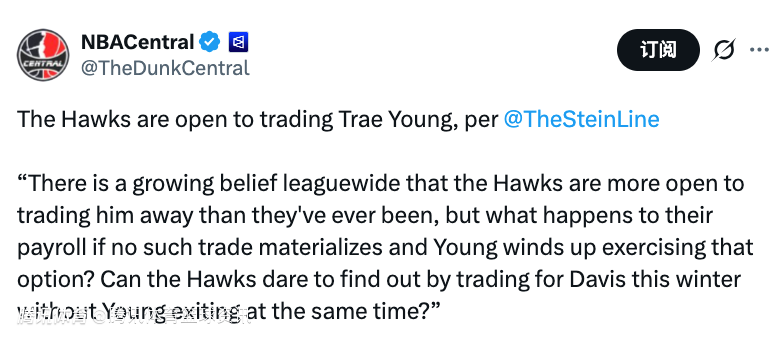 Stein表示:“全联盟越来越多的声音认为,老鹰交易特雷-杨的意愿达到了前所未有的程度。但问题在于,如果这笔交易最终未能达成,而杨选择执行球员选项,老鹰的薪资结构会面临怎样的困境?老鹰敢在不送走杨的前提下,于本赛季冬季交易得到戴维斯吗?”