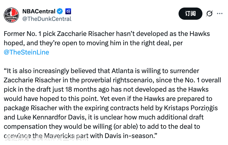 “外界普遍认为,老鹰愿意在理想情况下放弃里萨谢,这位去年的状元秀,至今的发展进度并未达到球队的期望。不过,即便老鹰准备将里萨谢与波尔津吉斯、肯纳德的到期合同打包,用于交易戴维斯,目前仍不清楚他们愿意(或能够)额外提供多少选秀权补偿,来说服独行侠在赛季中期放走戴维斯。”