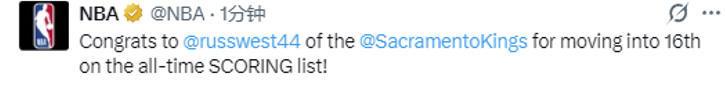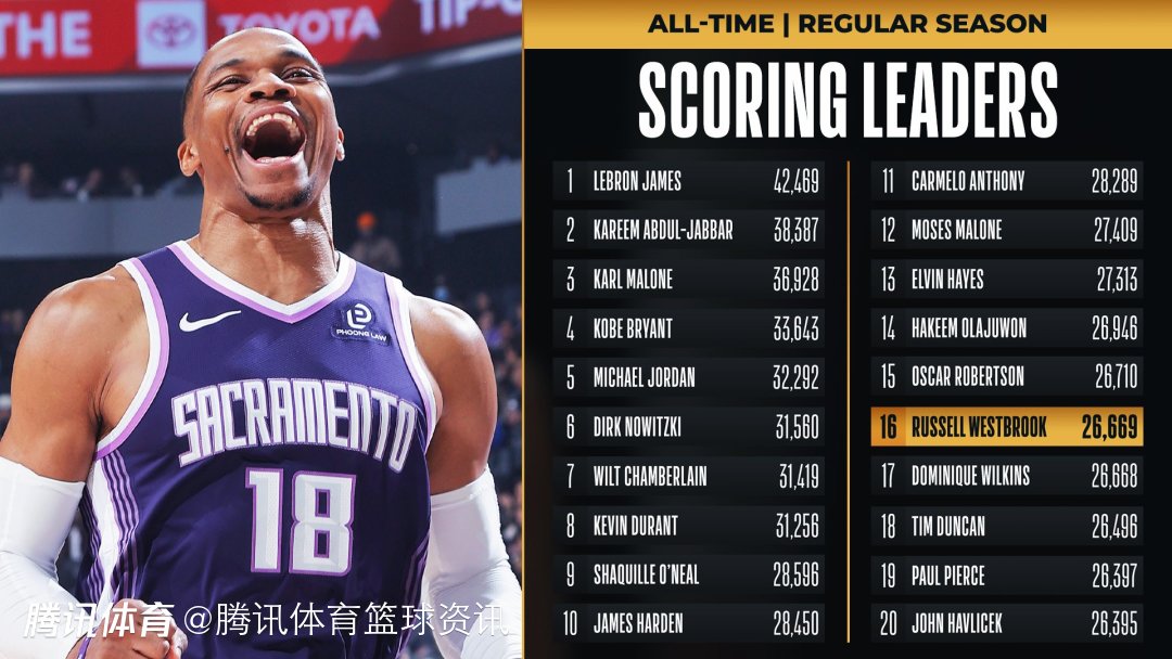 2025-12-29 13:00北京时间12月29日,NBA常规赛继续进行,在湖人队对阵国王队的比赛中,威斯布鲁克迎来里程碑,他的生涯总得分超越多米尼克-威尔金斯,升至NBA历史得分榜第16位。