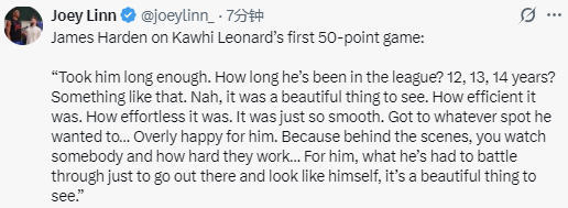 在谈到莱昂纳德生涯首次单场50+表现的话题时,哈登说道:“这一天确实让大家等太久了。他在联盟打多少年了?12年?13年?还是14年?差不多就这个数吧。不过说真的,看到他打出这样的表现真的太棒了。他的效率太高了,得分看起来毫不费力,整个过程行云流水,随心所欲地杀到任何他想去的位置,我真的为他感到无比开心。因为在场下,你亲眼见证着他日复一日的刻苦训练,想想他一路走来经历的伤病与挑战,如今能够重返赛场,打出属于自己的比赛,这样的画面真的太美好了。”