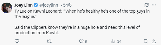 在谈到莱昂纳德的表现时,卢说道:“他终于完全康复了,能够出战足够多的时间,打出高效的表现。就像我说的,当他健康的时候,他就是联盟最顶尖的球员之一。最近我们已经看到了这样的他。他清楚球队目前的处境,知道我们的目标是什么,我们现在确实面临很大的困境,但我们只能一步一个脚印,一场一场地变得更好。我觉得今晚我们做到了这一点,就像我说的,小卡带头打出了这样的表现。”卢还表示,在祖巴茨受伤后,他曾与莱昂纳德和哈登对话,要求两人尽量多抢板。