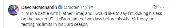 本场比赛是詹姆斯40岁的最后一场比赛,在谈到自己即将年满41岁时,詹姆斯说道:“我正在与‘时间老人’较量,我想说,在职业生涯的后半段,我正在狠狠击败他。”