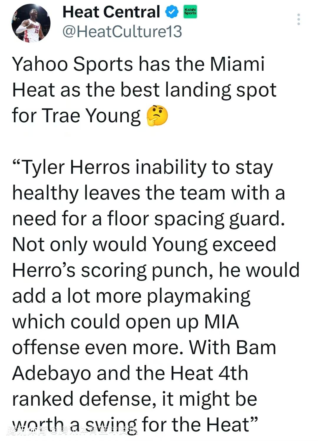 2025-12-30 05:30北京时间12月30日,美媒雅虎体育发文称,热火将是老鹰球星特雷-杨的最佳下家。