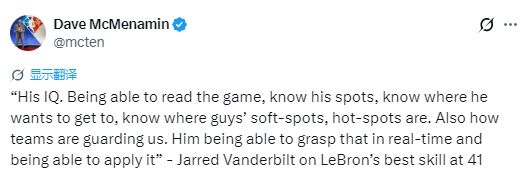 对于41岁的队友詹姆斯依旧保持着顶级水准,范德比尔特在评价其最强能力时如此说道:“是他的篮球智商。他能读懂比赛走势,清楚自己该在场上的什么位置落位,知道自己想攻击的区域,也能精准拿捏对手的弱点和火力点。除此之外,他还能快速判断对手的防守策略。他总能在比赛中实时洞察这些信息,并将其转化为赛场上的优势。”