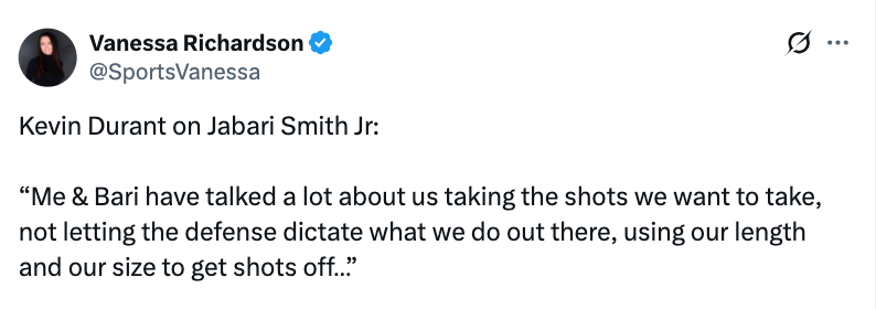 谈及小贾巴里-史密斯已经连续6场砍下15+得分,杜兰特表示:“毫无疑问,球队接下来的征程,太需要他延续这样的状态了。我和他聊过很多次,核心就一个,坚决出手我们的制胜球,果断投出我们想投的篮。永远别让对手的防守,牵着我们的节奏走、左右我们的进攻选择。我们要做的,就是扬长避短:利用我们的臂展优势,靠着我们的身高体型,稳稳创造出手机会、完成出手。”