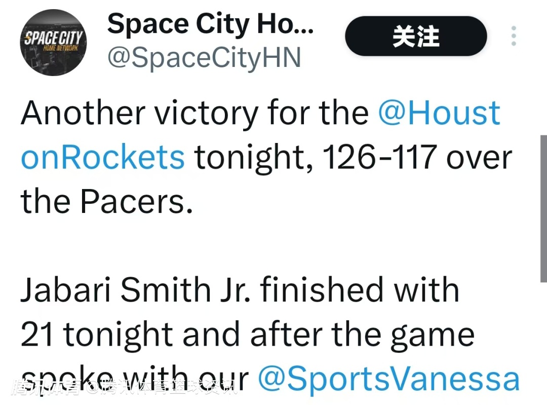 2025-12-30 12:40北京时间12月30日,NBA常规赛继续进行,火箭以126-119战胜步行者。本场比赛中,火箭球员小贾巴里-史密斯出战34分钟,投篮16中8,其中三分7中3,得到21分10篮板2助攻3盖帽。赛后,他接受媒体采访。