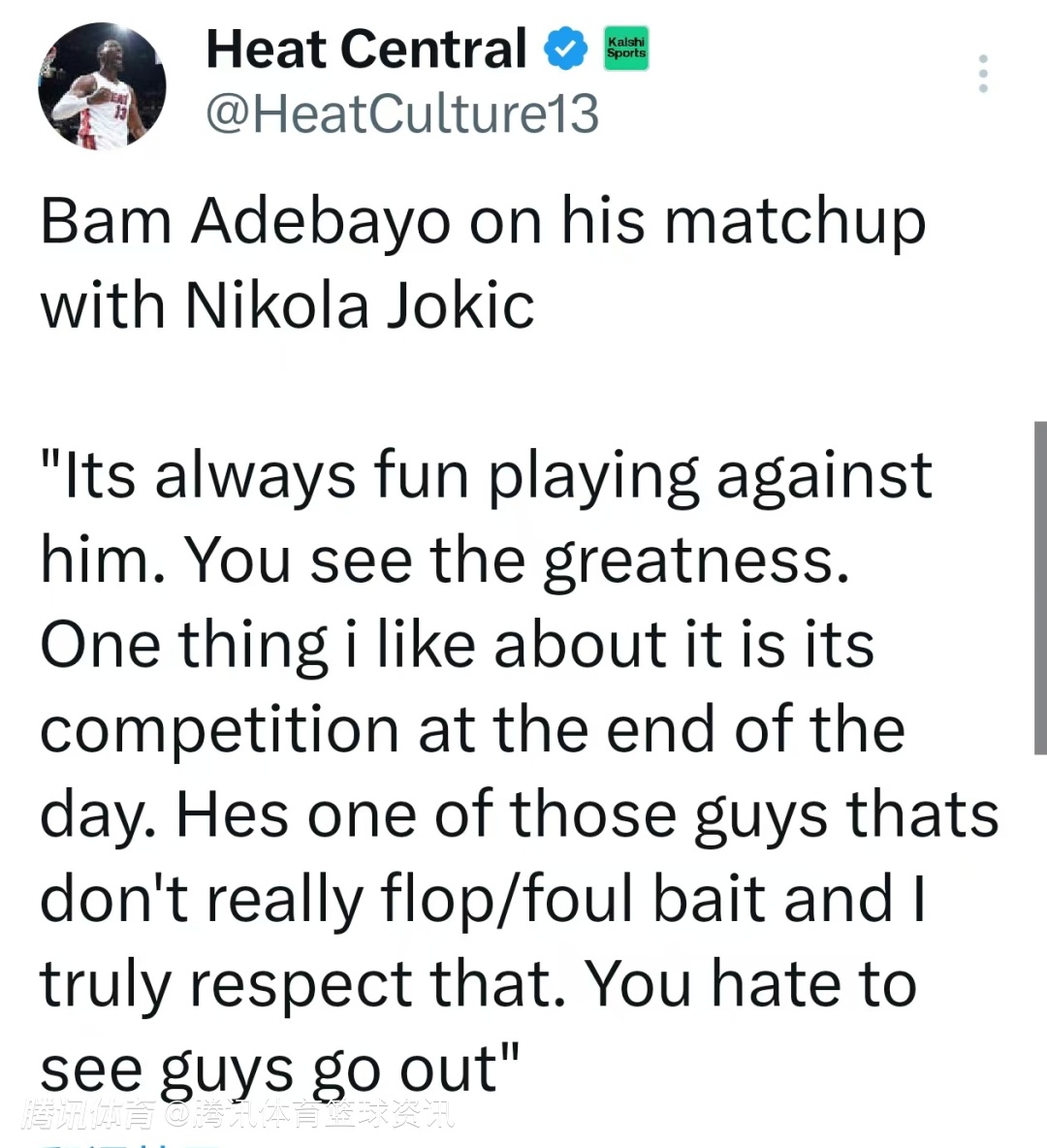 关于和约基奇的对位,阿德巴约说道:“对位他永远充满乐趣,你能亲眼见证伟大。说到底,这就是最纯粹的竞技对决。他从不爱假摔碰瓷,这一点我真心敬佩。真不愿看到这样的球员伤退。”