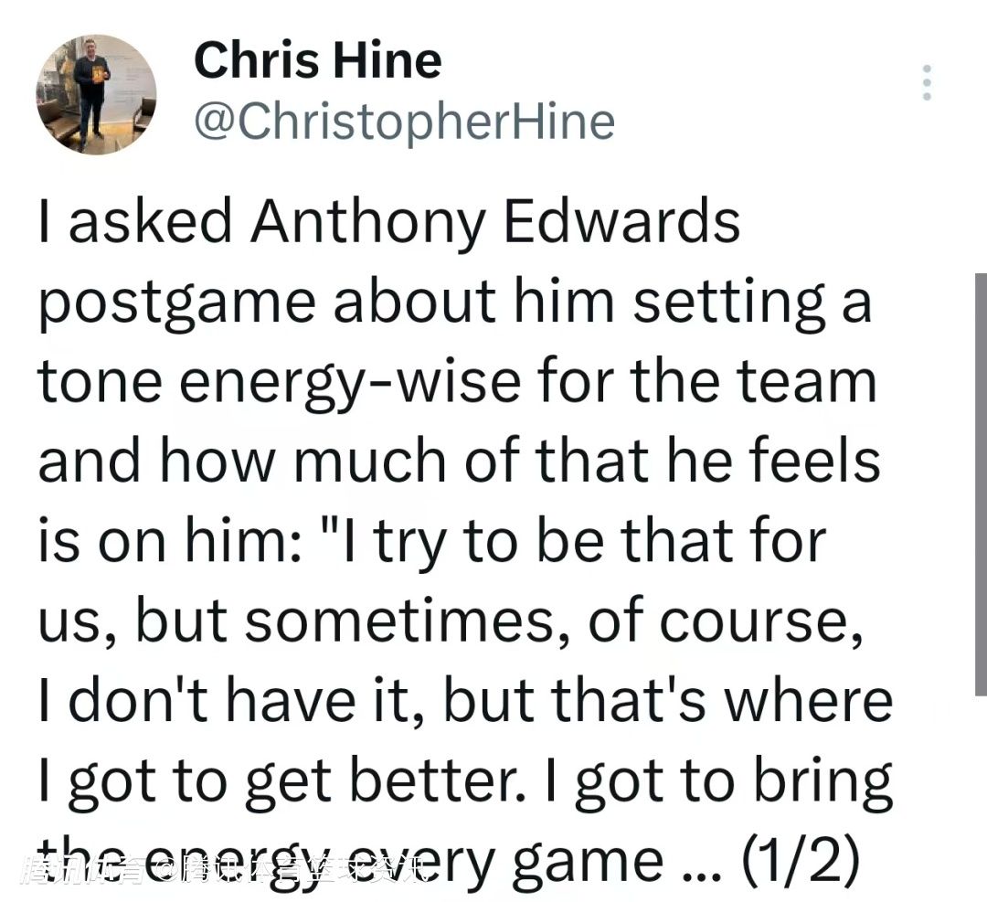 当被问及他如何为球队奠定活力基调,又认为这份责任有多重时,爱德华兹回应:“我一直努力做好这一点,但难免也有状态欠佳的时候,这正是我要提升的地方。必须每场都带足能量——不管是得分、防守,还是提前落位、退守兜底,无论做什么,每晚都要火力拉满。”