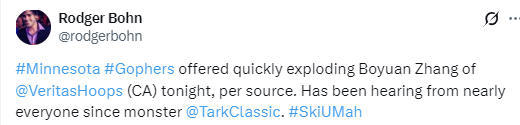 2025-12-30 14:50北京时间12月30日,根据NCAA记者Rodger Bohn报道,中国球员张博源已经获得明尼苏达大学的offer。