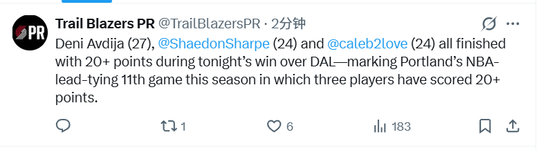 开拓者本赛季第11次3人同场20+ 追平联盟本赛季纪录