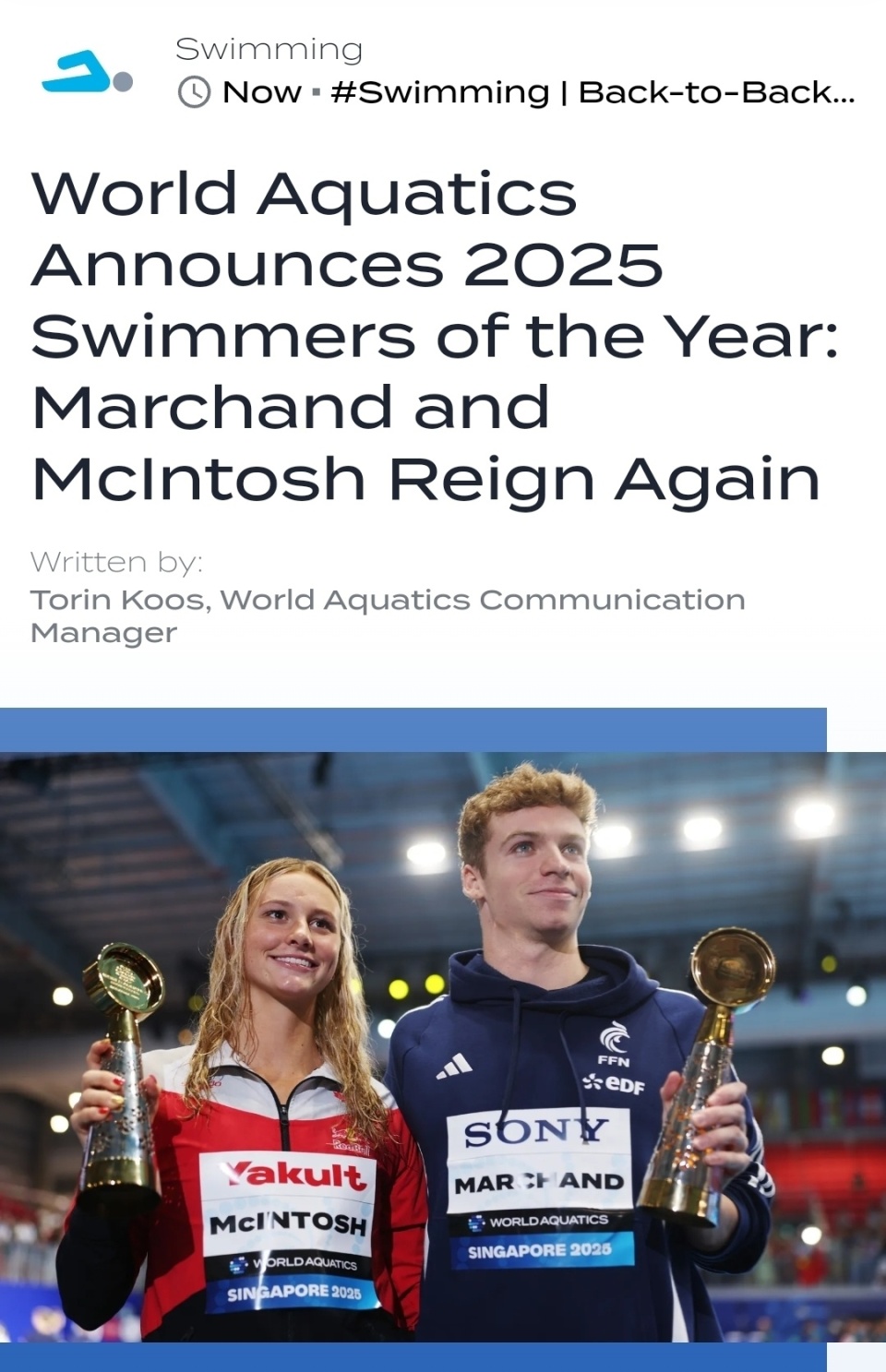 2025-12-30 21:20经过将近三周的投票,世界泳联赶在2025年的最后两天,确认公布来自法国的莱昂.马尔尚成为年度最佳男子游泳运动员;加拿大选手沙莫.麦金托什则是年度最佳女子游泳运动员。
