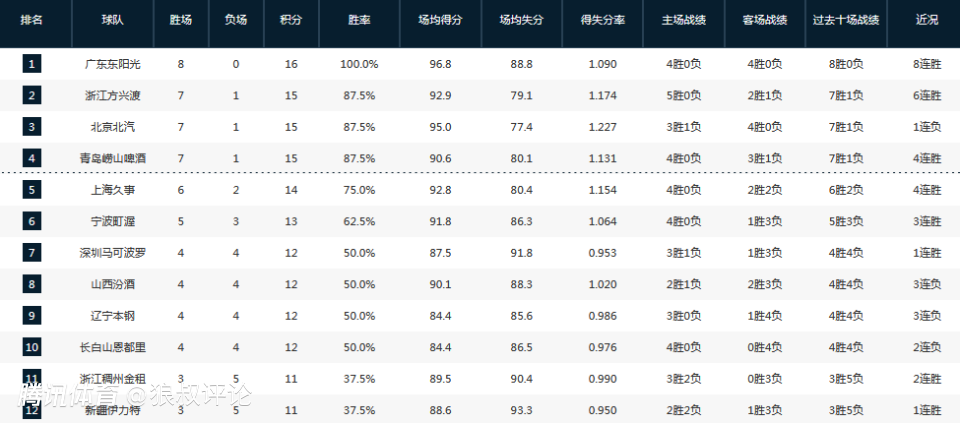 CBA最新排名:广东8连胜冲上榜首 黑马战绩狂飙 山西连败意外掉队