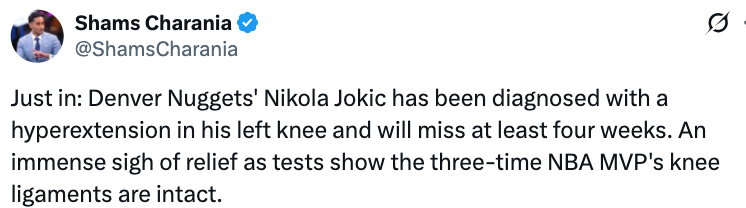 Shams:约基奇左膝过度伸展将缺席4周 韧带并未受损