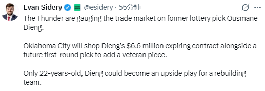 2025-12-31 06:20北京时间12月31日,据记者Evan Sidery报道,雷霆队正在为球队昔日的乐透秀奥斯曼-迪昂试水交易市场。