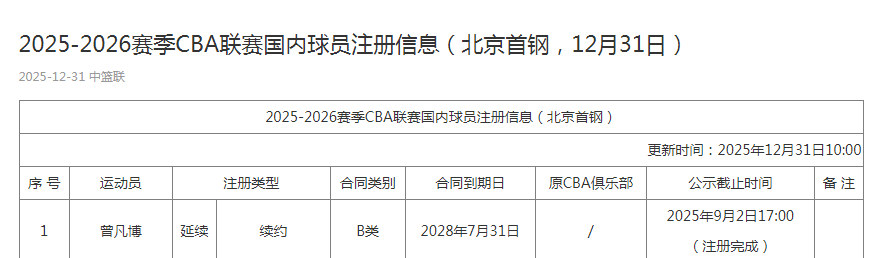 2025-12-31 11:00北京时间12月31日,CBA官方公布最新球员注册信息,曾凡博在今夏完成预注册后,如今终于正式完成注册,他将在2026年1月1日对阵广东的焦点京粤大战,迎来回归的正式首秀。